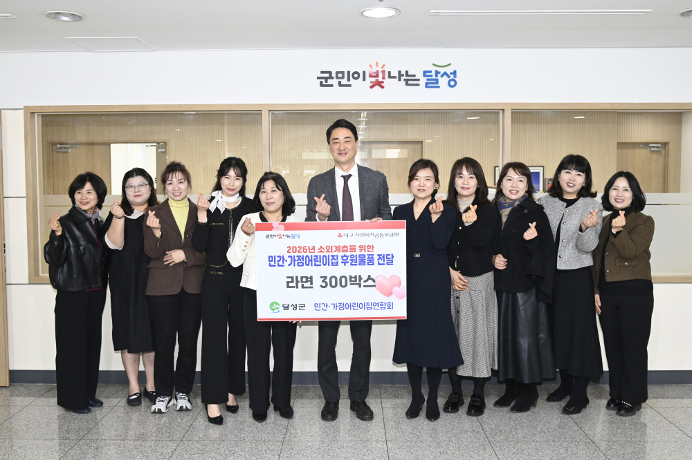 [경북도민방송=손중모기자] 달성군 민간·가정어린이집연합회가 고물가로 어려움을 겪는 이웃들을 위해 따뜻한 나눔을 실천하며 지역사회에 온기를 더했다.달성군은 17일 민간어린이집연합회와 가정어린이집연합회가 이웃돕기 후원물품으로 라면 300박스를 기탁했다고 밝혔다.이번 후원은 최근 물가 상승으로 생계 부담이 가중된 취약계층을 지원하기 위해 마련됐다.