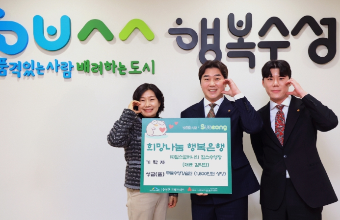 [경북도민방송=손중모 기자] ㈜짐스컴퍼니가 운영하는 짐스수영장은 지난 20일 무료 수영강습권(1,800만 원 상당)을 수성구에 기탁했다.해당 강습권은 수성구 드림스타트 아동을 대상으로 아동의 건강한 신체 발달을 지원하기 위해 짐스수영장 두산직영점에서 운영될 예정이다.짐스수영장 두산직영점은 아시안게임과 세계선수권대회에서 근대5종 금메달을 획득한 국가대표 출신 정훤호 원장이 대표감독을 맡고 있으며, 기초 물 적응 단계부터 대회 출전 수준까지 맞춤형 지도를 제공하고 있다. 특히 드림스타트 아동을 위한 강습도 직접 지도할 예정이다.김익현 ㈜짐스컴퍼니 대표는 “아동의 건강한 성장과 정서적 행복을 최우선으로 생각하는 기업의 가치에 부합하는 나눔에 동참하게 되어 뜻깊다”고 말했다.수성구청 관계자는 “이번 후원을 통해 취약계층 아동들이 수영 강습을 경험하며 건강하게 성장하는 계기가 되길 바란다”고 말했다.
