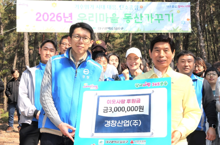 [경북도민방송=손중모 기자]대구 달서구는 경창산업㈜(대표 손일호, 차석주)으로부터 이웃사랑 후원금 300만 원을 기탁받았다고 26일 밝혔다. 경창산업㈜은 달서구가 주최한 ‘우리마을 동산가꾸기 나무심기 행사’에 직원들로 구성된 C&S봉사단이 참여했으며, 이와 함께 후원금도 전달하며 지역사회 나눔 실천에 동참했다. 경창산업㈜은 달서구 월암동에 소재한 자동차부품 제조기업으로, 1961년 설립 이후 60년 이상의 업력을 이어온 중견기업이다. 2014년에는 경창 C&S봉사단을 발족해 무료급식 봉사, 사랑의 연탄 나눔 등 다양한 사회공헌 활동을 지속하며 지역복지 증진에 기여하고 있다. 이날 기탁된 후원금은 관내 저소득 취약계층을 위한 복지사업에 사용될 예정이다. 이태훈 달서구청장은 “어려운 시기에 따뜻한 나눔을 실천해주신 경창산업에 깊이 감사드린다”며 “전달해주신 소중한 후원금은 꼭 필요한 곳에 의미 있게 사용하겠다”고 말했다. 이어 “탄소중립 실천과 쾌적한 환경 조성을 위한 나무심기 행사에도 함께해 주셔서 감사드린다”고 덧붙였다.