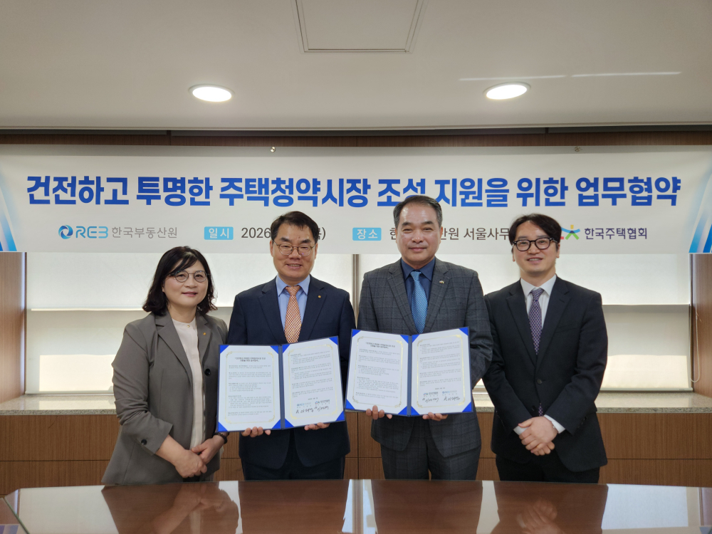 민·관 협업을 통해 제도적 사각지대를 보완하고 실효성 있는 예방 체계를 구축하겠다는 취지다.양 기관은 협약을 통해 ▲공정한 주택청약시장 조성을 위한 대국민 홍보 ▲견본주택 안내를 통한 올바른 청약 문화 확산 ▲부정청약 예방을 위한 정보 공유 및 협력 강화 등 다양한 분야에서 공동 대응에 나선다.특히 한국부동산원이 운영 중인 청약홈 시스템과 한국주택협회의 산업 현장 네트워크를 연계해 부정청약을 사전에 차단하는 실질적 예방 효과가 기대된다.이재명 시장관리본부장은 “청약홈 운영 경험과 주택협회의 산업 주도 역량이 결합되면 부정청약 근절을 위한 다각적 예방 활동이 가능해질 것”이라며 “지속적인 협업과 경험 공유를 통해 국민이 신뢰할 수 있는 청약시장 조성에 최선을 다하겠다”고 밝혔다.한편 양 기관은 이번 협약을 계기로 청약제도에 대한 국민 이해도를 높이고, 공정한 주택 공급 질서를 확립하는 데 정책적 역량을 집중할 계획이다.