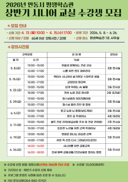 [경북도민방송=최진수 기자]안동시 평생학습관은 지역 어르신들의 활기찬 노후 생활과 자기계발을 지원하기 위해 ‘2026년 상반기 시니어교실’ 수강생을 모집한다.모집 기간은 오는 4월 13일 오전 10시부터 15일 오후 5시까지다. 신청 대상은 안동시에 거주하는 65세 이상 시민으로, 보다 많은 시민에게 학습 기회를 제공하기 위해 2025년도 기 수강자는 제외된다. 접수는 본인이 직접 방문 신청해야 한다.특히 올해부터는 기존 선착순 방식의 불편을 해소하고자 전산 추첨 방식을 도입한다. 추첨은 4월 17일(금) 오전 10시 30분 평생학습관 사무실에서 공개적으로 진행될 예정이다.이번 교육은 5월 8일부터 6월 26일까지 2개월간(매주 금요일 오후 1시~5시) 운영된다. 교육 과정은 시니어들의 실생활에 실질적인 도움이 되는 4개 분야, 16개 강좌로 맞춤형 커리큘럼으로 구성됐다.주요 프로그램은 ▲지식 분야는 디지털 격차 해소를 위한 AI 활용법, 보이스피싱 예방 등 금융교육 ▲건강 분야는 뇌 인지기능 향상을 위한 뇌 운동과 근력 강화를 위한 셀프 홈트레이닝 ▲교양 분야는 삶의 지혜를 더하는 명리학, 예술적 감성을 깨우는 명화 감상 ▲취미 분야는 자신감을 높여주는 퍼스널 이미지메이킹 및 셀프 피부 관리 등이다.안동시 평생학습관 관계자는 “어르신들의 욕구를 반영해 인문, 교양뿐만 아니라 최신 트렌드인 AI 교육까지 아우르는 균형 잡힌 프로그램을 준비했다”며 “앞으로도 시니어 맞춤형 교육을 통해 배움의 기쁨을 전달하는 데 최선을 다하겠다”고 밝혔다.