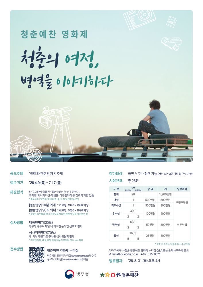 심사는 7~8월 중 진행되며 병무청 유튜브 채널을 통한 국민참여 온라인 평가(30%)와 내·외부 전문가로 구성된 심사위원회 평가(70%)를 합산해 최종 수상작을 선정한다.최종 선정작은 총 28편으로, 대상과 최우수상은 일반부와 학생부 구분 없이 선발되며, 우수상·장려상·입선은 일반부와 학생부로 나눠 시상한다. 총상금은 1,900만원 규모다.영화제 관련 세부 내용과 접수 방법은 공식 누리집을 통해 확인할 수 있으며, 운영사무국을 통한 문의도 가능하다.임준모 대구경북지방병무청장은 “병역은 우리 사회를 지탱하는 숭고한 헌신이자 청춘이 성장하는 소중한 시간”이라며 “이번 영화제를 통해 병역의 가치가 새롭게 조명되고, 국민의 공감을 이끌어낼 수 있는 작품들이 많이 나오길 기대한다”고 말했다.