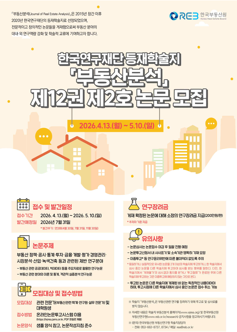 [경북도민방송=손중모기자] 이 부동산 분야 학술 교류 활성화를 위해 등재학술지 `부동산분석`논문 공모에 나섰다.한국부동산원은 오는 7월 31일 발간 예정인 「부동산분석」 제12권 제2호에 수록할 논문을 5월 10일까지 모집한다고 13일 밝혔다.공모 분야는 부동산 정책과 공시, 통계, 투자, 금융, 개발, 평가, 경영관리, 시장분석, 산업, 녹색건축 등 부동산 전반을 아우른다. 관련 분야 전문가와 대학원생이면 누구나 투고할 수 있다.논문 접수는 온라인 논문투고시스템을 통해 진행되며, 세부 사항은 「부동산분석」 누리집과 한국부동산원 부동산연구원 누리집 공지사항에서 확인할 수 있다.한국부동산원은 이번 공모를 통해 다양한 시각과 전문성을 갖춘 연구자 참여를 확대하고, 부동산 시장에 대한 심층 연구 기반을 강화한다는 방침이다.김근용 부동산연구원장은 “연구자들의 적극적인 참여를 통해 부동산 시장을 둘러싼 다양한 논의가 더욱 확산되기를 기대한다”며 “학술지 `부동산분석`이 연구 생태계 활성화의 플랫폼으로 자리매김할 수 있도록 지속적으로 노력하겠다”고 말했다.