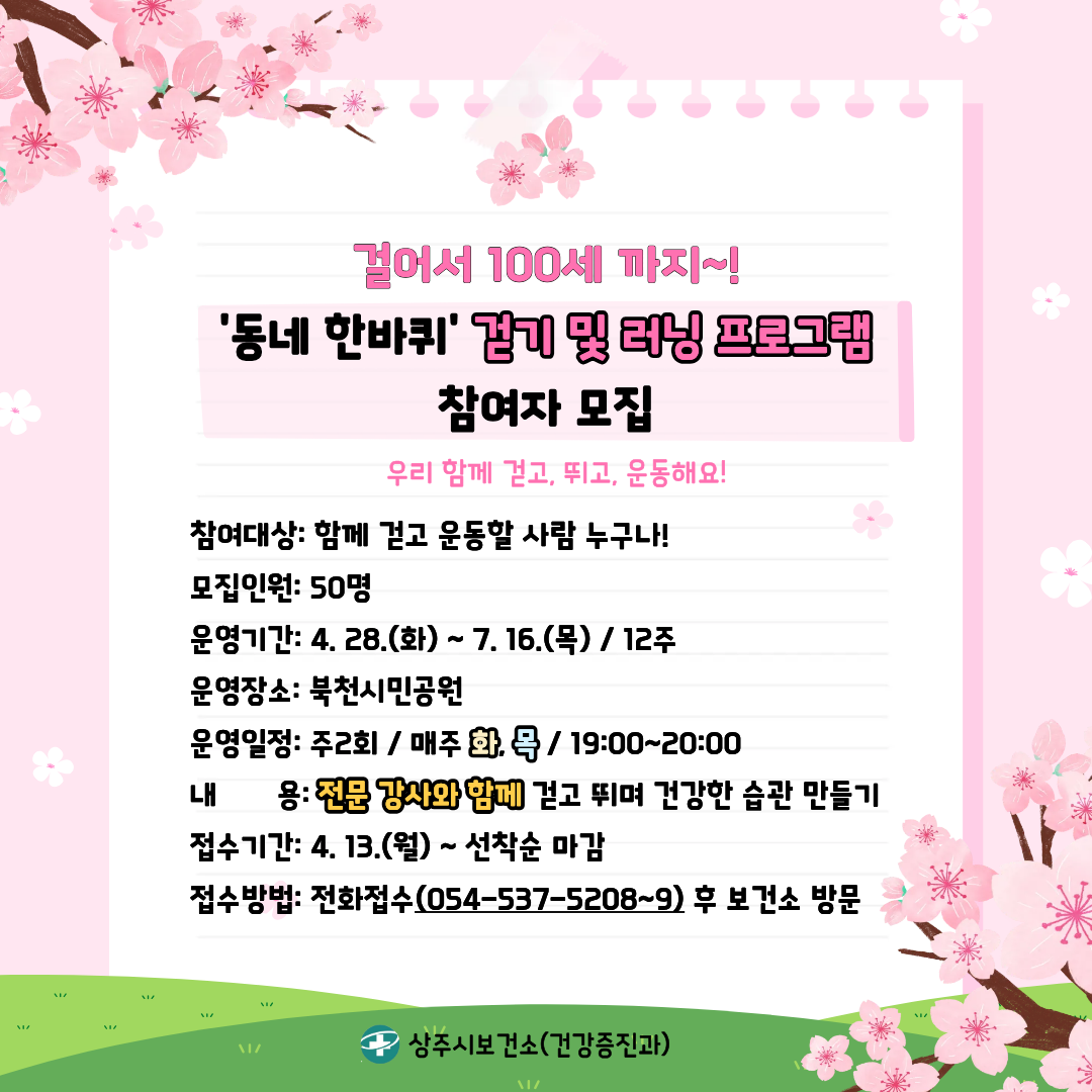 [경북도민방송=손중모기자] 상주시보건소가 시민들의 일상 속 신체활동을 유도하기 위한 생활밀착형 건강 프로그램을 운영한다.상주시보건소는 지역주민의 신체활동 증진과 건강한 생활습관 형성을 위해 ‘동네 한바퀴’ 걷기 및 러닝 프로그램을 추진하고 참여자를 모집한다고 14일 밝혔다.이번 프로그램은 누구나 쉽게 실천할 수 있는 걷기와 러닝을 중심으로 구성해 시민들의 자발적인 운동 참여를 유도하고, 규칙적인 신체활동 습관 형성을 지원하는 데 초점을 맞췄다.운영 기간은 오는 28일부터 7월 16일까지 12주간이며, 북천시민공원에서 매주 화요일과 목요일 오후 7시부터 8시까지 주 2회 진행된다.