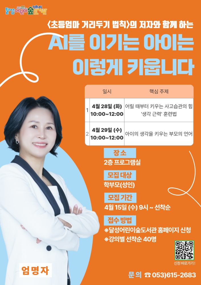 [경북도민방송=손중모기자] 달성군 달성어린이숲도서관이 학부모 대상 맞춤형 교육 프로그램을 마련했다.달성어린이숲도서관은 부모교육 특강 ‘AI를 이기는 아이는 이렇게 키웁니다’ 수강생을 오는 15일부터 선착순 모집한다고 밝혔다.이번 특강은 자녀 교육에 관심 있는 학부모 누구나 신청할 수 있으며, 모집 인원은 강연별 각 40명이다. 신청은 도서관 누리집을 통해 접수하면 된다.강의는 28일과 29일 양일간 오전 10시부터 2시간씩 진행된다.