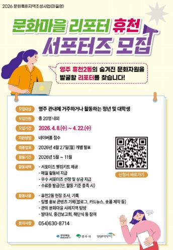 재단은 2026년 문화특화지역조성사업(마을형)의 일환으로 ‘문화마을리포터 : 휴천’ 서포터즈를 모집한다고 15일 밝혔다.
