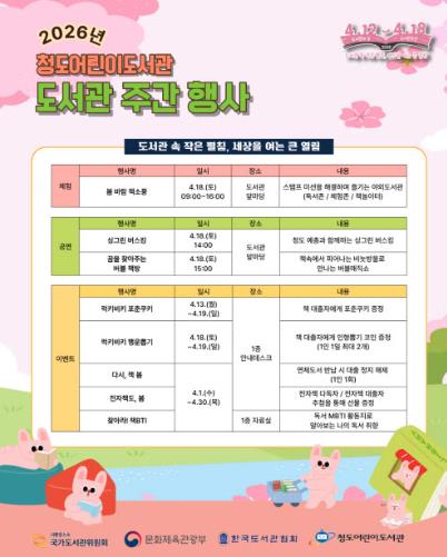 [경북도민방송=이종환 기자]청도군은 제62회 도서관주간 및 세계 책의 날(4월 12일)을 맞아 오는 18일 야외도서관 프로그램`봄바람 책소풍`을 운영한다. 4월 도서관주간은`도서관 속 작은 펼침, 세상을 여는 큰 열림`을 슬로건으로 4월 12일부터 18일까지 전국 공공도서관을 중심으로 다양한 독서문화 행사가 펼쳐진다. 특히, 청도어린이도서관은 색다른 독서경험을 제공하기 위해 야외도서관을 테마로 한 `봄바람 책소풍`을 18일 운영한다. 이번 행사에서는 ▲ 독서존·체험부스·책놀이터로 구성된 야외도서관 ▲ 6가지 미션을 수행하는 `스탬프 미션`이벤트 ▲ 싱그린 버스킹 및 독서권장 버블쇼 등 무대공연 ▲ 행운의 독서뽑기, 리사이클링 드로잉 등 부대행사가 진행될 예정이다. 이와 함께 4월 한 달 동안 전자책 대출이벤트 `전자책도, 봄`을 비롯해 포춘쿠키 증정, 찾아라 책BTI 등 다채로운 독서체험 프로그램도 운영한다. 도서관 관계자는 “야외도서관을 통해 도서관의 공간을 확장하고, 이용자들이 보다 즐겁게 독서를 경험하는 계기가 되길 바란다”고 말했다. 행사와 관련한 자세한 사항은 청도어린이도서관 홈페이지에서 확인할 수 있으며, 기타 문의사항은 청도어린이도서관으로 하면 된다.