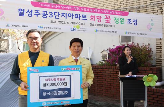 [경북도민방송=손중모 기자] 대구 달서구는 풍국주정공업(주)로부터 이웃사랑 후원금 300만원을 기탁받았다고 16일 밝혔다. 풍국주정공업(주)는 지난 7일 열린‘영구임대아파트 희망 꽃 정원 조성’행사에 직원봉사단 30여 명이 참여해 월성주공3단지 일대에서 꽃 심기 봉사활동을 펼쳤다. 이날 행사와 함께 지역사회 나눔 실천의 일환으로 후원금을 전달했다. 풍국주정공업(주)는 달서구에 소재한 주정 생산 기업으로, 1954년 설립 이후 70여 년간 운영되고 있는 중견기업이다. 2011년부터 다양한 사회공헌활동을 이어오며 지역복지 증진에 기여하고 있다. 이날 기탁된 후원금은 관내 저소득 취약계층을 위한 복지사업에 사용될 예정이다. 성춘태 대표이사는 “어려운 시기일수록 함께하는 가치가 더욱 중요하다고 생각한다”며 “작은 정성이지만 꼭 필요한 곳에 도움이 되길 바라며, 앞으로도 나눔을 실천하는 기업이 되겠다”고 말했다. 이태훈 달서구청장은 “지역사회를 위해 따뜻한 나눔을 실천해 주신 풍국주정공업에 깊이 감사드린다”며 “전달해 주신 후원금은 복지 사각지대를 해소하고 사회안전망을 강화하는 데 소중히 사용하겠다”고 밝혔다. 이어 “희망 꽃 정원 조성 활동에도 함께해 주셔서 감사드린다”고 덧붙였다.