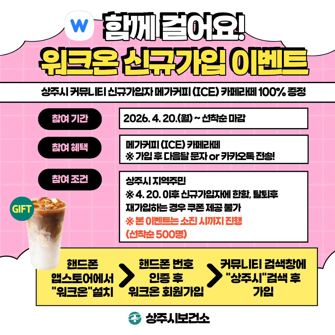 이번 행사는 시민들의 앱 가입을 유도하고 커뮤니티 활동 참여를 통해 생활 속 걷기 실천을 활성화하기 위해 마련됐다.참여 방법은 간단하다. 스마트폰 플레이스토어 또는 앱스토어에서 워크온 앱을 내려받아 회원가입을 완료한 뒤, 커뮤니티 검색창에서 상주시를 검색해 해당 커뮤니티에 가입하면 된다.