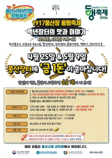 [경북도민방송=최진수 기자]안동시 풍산시장이 100년의 시간을 거슬러 올라가 옛 장터의 활기를 재현한다.안동시는 오는 4월 25일과 5월 9일 이틀간 풍산장터 일원에서 ‘1917 풍산장 동행축제 `백년장터의 맛과 이야기`’를 개최한다. 이번 축제는 1917년부터 이어온 풍산장의 역사성을 알리고, 소상공인과 소비자가 함께 즐기는 상생의 장으로 마련됐다.축제 기간 풍산장터는 과거로 여행을 떠난 듯한 이색적인 풍경으로 채워진다. ‘1917 주막거리’에서는 안동소주와 한우 불고기, 장터국밥 등 풍산만의 먹거리를 시음하거나 맛볼 수 있으며, ‘장돌뱅이 장터’에서는 보부상 프리마켓과 엿장수, 뻥튀기 등 추억의 주전부리가 관람객을 맞이한다. 이와 함께 국악 공연, 즉석 노래자랑, 장터 버스킹 등이 어우러진 ‘1917 장터공연’이 축제의 흥을 돋울 예정이다.방문객들을 위한 파격적인 혜택과 이벤트도 풍성하다. 축제 전용 엽전(쿠폰) 구매 시 20% 할인 교환 이벤트가 진행돼 알뜰한 장보기가 가능하며, 장터 경매와 흥정 이벤트 등 전통시장만의 재미를 살린 프로그램도 운영된다. 특히 풍산읍 중심상권에서 3만 원 이상 구매한 영수증을 지참하면 ‘순금 1돈’의 주인공이 될 수 있는 경품 응모 기회가 주어진다. 경품 추첨은 행사 당일 오후 4시부터 장옥 무대에서 진행되며, 현장 참석자에 한해 지급된다.이번 축제는 안동의 대표 관광지인 하회마을과 풍산시장을 잇는 ‘전통시장 왔니껴 투어’ 코스와 연계 운영돼, 관광객들에게 더욱 알찬 여행 경로를 제공한다. 떡메치기․전통놀이․장터 스탬프 투어 등 직접 참여하고 즐길 수 있는 체험 프로그램도 마련돼 가족 단위 방문객들에게 특별한 추억을 선사할 것으로 보인다.안동시 관계자는 “1917년부터 지역 경제의 중심 역할을 해온 풍산시장의 매력을 널리 알리고자 이번 축제를 기획했다”며, “맛있는 먹거리와 즐거운 쇼핑, 그리고 순금의 행운까지 함께하는 풍산장터에서 백년 장터의 깊은 맛과 이야기를 만끽하시길 바란다”고 전했다.