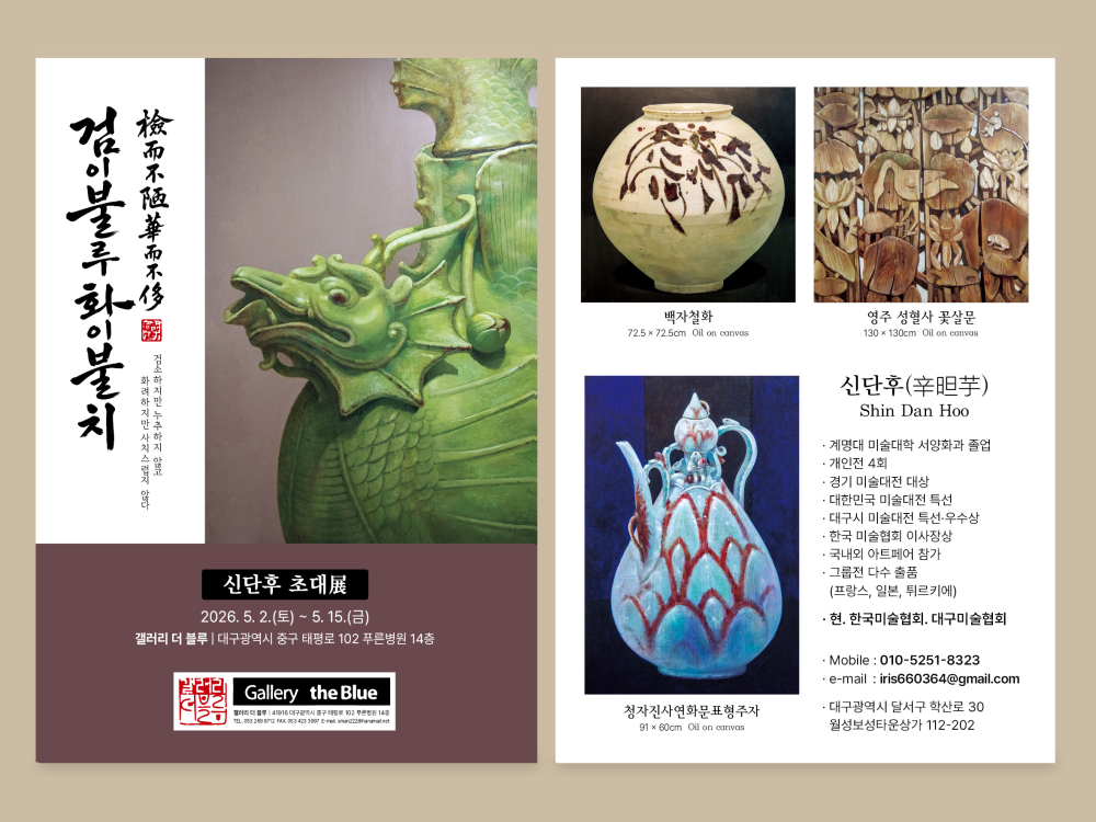 경기미술대전 대상, 대한민국미술대전 특선, 대구시미술대전 특선·우수상 등을 수상하며 작품성을 인정받았다. 현재 한국미술협회와 대구미술협회 회원으로 활동 중이다.갤러리 관계자는 “이번 전시는 전통 공예의 미와 회화적 해석이 어우러진 신단후 작가의 작품세계를 집중 조명하는 자리”라며 “지역 미술 애호가들에게 색다른 감상 경험이 될 것”이라고 말했다.관람은 무료이며, 자세한 사항은 갤러리 더 블루를 통해 확인할 수 있다.