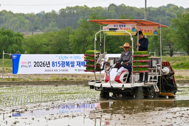 [경북도민방송=손중모 기자] 영주시와 안정농협은 27일 안정면 오계리 최이한 농가의 논에서 ‘2026년 8·15광복쌀 재배단지 첫 모내기 행사’를 개최했다고 밝혔다.‘8·15광복쌀’은 쌀 시장 개방 속에서 쌀의 소중함을 되새기고 농가의 어려움을 극복하고자 2012년부터 안정농협과 협력해 개발한 추석용 햅쌀 브랜드로, 영주의 대표 특산물이다.특히 광복절의 의미를 되새기며 미래세대에게 애국심을 전하고, 조기 수확을 통해 농가의 소득을 높이는 두 가지 가치를 함께 담고 있다.올해 재배되는 품종은 조생종인 ‘진옥벼’, ‘해담벼’, ‘빠르미’로, 병해충에 강하고 밥맛이 우수해 추석 전 수확이 가능한 것이 특징이다.영주시는 광복쌀의 안정적인 생산 기반 마련을 위해 안정농협과 협력해 총 20헥타르 규모의 계약재배 단지를 조성하고, 120톤의 쌀을 생산할 계획이다.
