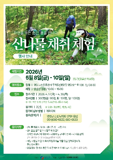특히 가족 단위 방문객은 물론 자연 체험을 선호하는 청년층과 중장년층까지 폭넓은 연령대가 함께 즐길 수 있어 축제의 대표 체험 콘텐츠로 자리매김할 것으로 기대된다.영양군 관계자는 “산나물채취체험행사는 자연 속에서 직접 봄을 느낄 수 있는 대표 프로그램으로 영양산나물축제를 더욱 풍성하게 만드는 핵심 콘텐츠”라며 “참가자들이 일월산의 자연을 체험하며 산나물의 매력을 마음껏 느끼길 바란다”고 말했다.